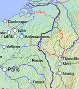 The First Army began a retirement towards Charleroi, because the French success in Belgium was contributing to the disaster on the Meuse at Sedan and on 16 May, Blanchard was ordered to retreat to the French border.[36][34] The British also began to retreat to the Escaut and the First Army was pushed back closer to the Charleroi–Brussels Canal.[38] Next day, parts of the BEF began to retreat towards the Dender river as the British reorganised to face the threat on their right flank against the Germans who had broken through south of the First Army. The First Army retreated to a line from Ath, southwards to Lens to link with the remainder of the Ninth Army at Mons; only exiguous forces remained between Maubeuge and Attigny. Allied forces in Belgium continued the retreat on 18 May to the Escaut and towards the French border further south. The Germans followed up the Allied retreat on Sunday 19 May but made a much greater effort in the south from the Meuse, along the Somme river valley, towards the Channel coast. Parts of the Seventh Army began to assemble from Péronne along the Somme and Ailette rivers, across the Oise to Coucy-le-Chateau.[39]