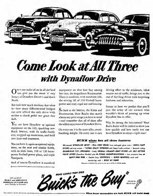 The transmission was incapable of automatic shifting, requiring the driver to move the shift lever from low to drive to cause an upshift. Buicks equipped with the Dynaflow transmissions were unique among American automobiles of the time in that the driver or their passengers would not detect the tell-tale interruption in acceleration that resulted when other automatic transmissions of the time shifted through their gears. Acceleration through a Dynaflow was one smooth (if inefficient and slow[1]) experience. It was because of this slow acceleration that the Dynaflow transmission was nicknamed "Dynaslush."[3]