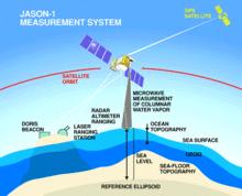 The sea surface height (SSH) is calculated through altimetry satellites, which determine the distance from the satellite to a target surface by measuring the satellite-to-surface round-trip time of a radar pulse.[5][6] The satellites then measure the distance between their orbit altitude and the surface of the water. Due to the differing depths of the ocean, an approximation is made. This is called the Arbitrary Reference Surface. Arbitrary Reference Surface is an estimated surface that is calculated to factor in the shape of the Earth. The general shape of the earth is spherical, but flattened out at the North and South Pole. This approximated surface is called the reference ellipsoid. This enables data to be taken precisely due to the uniform surface level. The satellite's altitude then has to be calculated with respect to the reference ellipsoid. It is calculated using the orbital parameters of the satellite and various positioning instruments. The sea surface height is then the difference between the satellite's altitude relative to the reference ellipsoid and the altimeter range. The satellite sends microwave pulses to the ocean surface. The travel time of the pulses ascending to the oceans surface and back provides data of the sea surface height. In the image below you can see the measurement system using by the satellite Jason-1.[7]