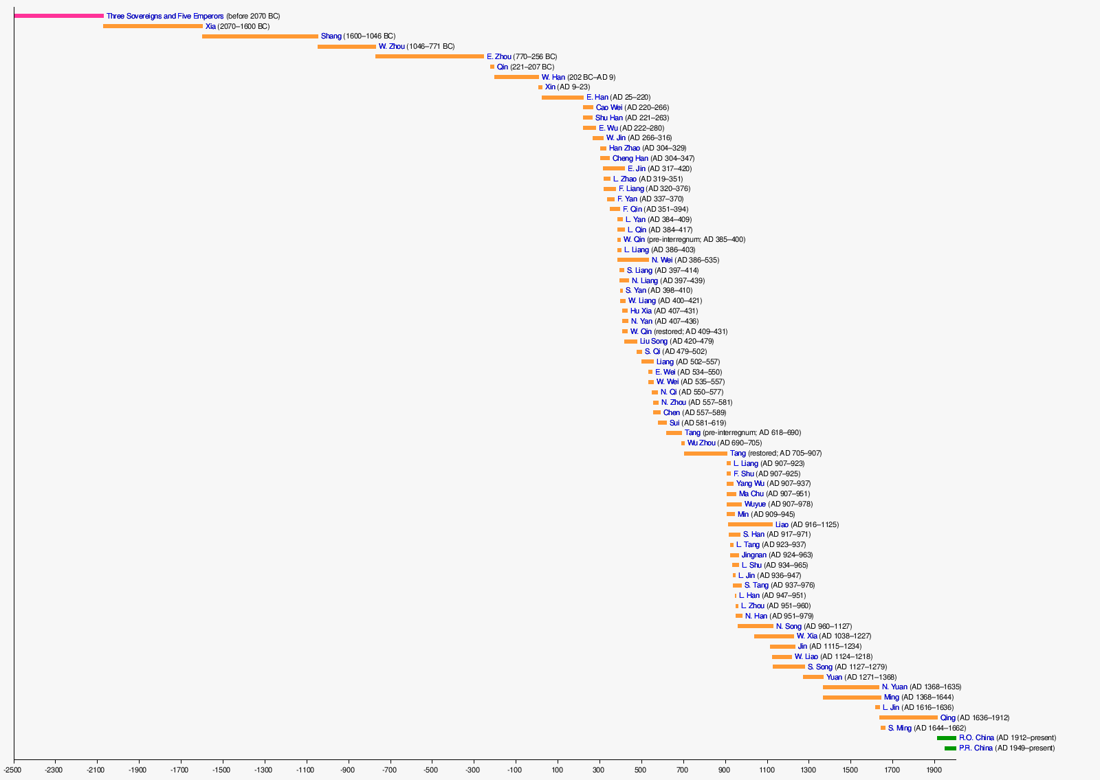 As most Chinese historiographical sources uphold the idea of unilineal dynastic succession, only one dynasty could be considered orthodox at any given time.[66] Most modern sources consider the legitimate line of succession to be as follows:[66]