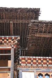 The roofs are massively constructed in hardwood and bamboo, highly decorated at the eaves, and are constructed traditionally without the use of nails. They are open at the eaves to provide a ventilated storage area. They were traditionally finished with timber shingles weighted down with stones; but in almost all cases this has now been replaced with corrugated galvanised iron roofing. The roof of Tongsa Dzong, illustrated, is one of the few shingle roofs to survive and was being restored in 2006/7.