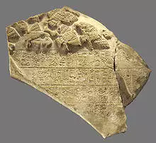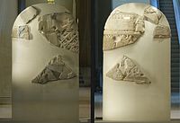 The so-called Stele of the Vultures, now in the Louvre, is a fragmented limestone stele found in Telloh, (ancient Girsu) Iraq, in 1881. The stele is reconstructed as having been 1.80 metres (5 ft 11 in) high and 1.30 metres (4 ft 3 in) wide and was set up ca. 2500–2400 BCE.[10] It was erected as a monument of the victory of Eannatum of Lagash over Ush, king of Umma, leading to a boundary treaty with his successor Enakalle of Umma.[11][5]