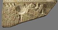 Eannatum, King of Lagash, riding a war chariot (detail of the Stele of the Vultures). His name "Eannatum" (��������) is written vertically in two columns in front of his head. Louvre Museum.