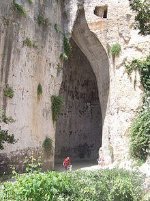 The Ear of Dionysius (Italian: Orecchio di Dionisio) is a limestone cave carved out of the Temenites hill in the city of Syracuse, on the island of Sicily in Italy. Its name, given by the painter Michelangelo da Caravaggio, comes from its similarity in shape to the human ear. The name is also linked to the acoustic effects inside the cave: it is told that people's voices echo up to 16 times.