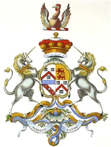 | Arms: Quarterly: 1st & 4th, Argent, a Chevron Gules, between three square Buckles Sable (Moreton); 2nd & 3rd, Or, two Lions passant guardant Gules (Ducie). Crest: A Moorcock’s Head Or, combed and wattled Gules, between two Wings displayed Azure. Supporters: On either side a Unicorn Argent, armed,unguled, maned and tufted Or, gorged with a Ducal Coronet per pale Gold and Gules. | |