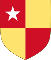 The principal Oxford coat of arms or shield was quarterly gules and or (red and yellow) with an argent (white) five-pointed star called a mullet or molet in the first canton. By De Vere family tradition this molet is said to refer to a reappearance of the Star of Bethlehem which showed itself to an earlier De Vere while on a Crusade and thus led him to victory. In the 14th and 15th centuries the family livery worn by their retainers was orange/tawney decorated with a white molet. A later badge associated with the De Veres is a blue boar. A later shield variation of the De Vere white molet has a smaller blue molet located within the white one but this may be a simple cadency mark – in heraldry the molet is also used in any family to indicate the third son of a title holder. The third son bears his father's arms differenced with a molet.
