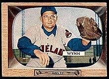 Afflicted by pneumonia to begin the 1955 season, Wynn did not earn his first win until May.[82] On May 22, he threw a shutout against the Tigers, allowing just one hit when Fred Hatfield singled in the fourth inning.[83] On June 22, he struck out 10 batters in a 5–0 shutout victory over the Baltimore Orioles.[84] Four days later, in the first game of a doubleheader, he recorded eight strikeouts and allowed just three hits in a 5–0 victory over the Yankees.[85] On July 1, he threw a third shutout in a row as the Indians defeated the White Sox 1–0.[86] He was an All-Star for the second time in his career and pitched three scoreless innings in the game.[87] This selection marked the start of eight consecutive All-Star Games he would be selected to over the next six seasons.[a][9] He finished the 1955 season with a 17–11 record and a 2.82 ERA.[9] Wynn's 17 wins were tied with Turley for fourth in the AL (three pitchers had 18), his 2.82 ERA was third (behind Pierce's 1.97 and Whitey Ford's 2.63), and his 122 strikeouts ranked seventh. Also, his six shutouts were tied with Pierce and Turley for second, behind Billy Hoeft's seven.[89] That season, Wynn began writing a column for The Cleveland News entitled The Wynn Mill, he did it without any assistance from ghostwriters despite the fact that he had never finished high school. He gave his opinions concerning everything from umpires to Indians coaches, to the frustration of Indians' general manager Hank Greenberg. Wynn donated his payment for the column to the Elks Club in Nokomis, Florida, where he lived during the offseason.[1]