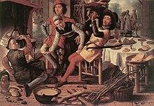 Breakfast[4] does not receive much attention in any sources. As in the Middle Ages, breakfast in the sense of an early morning meal, is largely absent from the sources. It's unclear if this meant it was universally avoided or that it simply was not fashionable enough to be mentioned, as most sources were written by, for, and about the upper class. There is no doubt that working people since medieval times ate some sort of morning meal, but it is unclear exactly at what time and what it consisted of. Peasants in the early modern world commonly ate a diet that consisted of "gruels, pottages, and ... grains". [5] Breakfast, when it began to be fashionable, was usually just a coffee, tea or chocolate, and did not become a more substantial meal in many parts of Europe until the 19th century. In the south, where supper was the largest meal, there was less need for breakfast, and it therefore remained unimportant, something that can still be seen today in the traditionally light breakfasts of southern Europe, which usually consists of coffee or tea with bread or pastry.