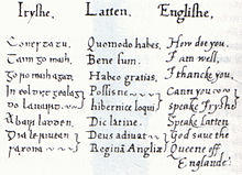 - ^ T. W. Moody; F. X. Martin; F. J. Byrne (12 March 2009). "The Irish Language in the Early Modern Period". A New History of Ireland, Volume III: Early Modern Ireland 1534-1691. Oxford University Press. p. 511. ISBN 9780199562527. Retrieved 6 February 2015.