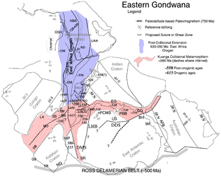 - ^ Boger, S. D.; Fanning, C. J. L.; Fanning, C. M. (2001). "Early Paleozoic tectonism within the East Antarctic craton: The final suture between east and west Gondwana?". Geology. 29 (5): 463–466. Bibcode:2001Geo....29..463B. doi:10.1130/0091-7613(2001)029<0463:EPTWTE>2.0.CO;2.