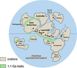 East Antarctica comprises Archean and Proterozoic-Cambrian terranes that amalgamated during Precambrian and Cambrian times.[5][6] In the time of the supercontinent Rodinia, western Australia and East Antarctica were linked by the two-stage Albany-Fraser-Wilkes orogen, which occurred between 1350-1260 Ma and 1210-1140 Ma, and also the older, Mawson craton.[7] It is estimated that Rodinia formed between 1100 Ma and 1000 Ma.[2] During this time, there was tectonism occurring from Coats Land to the Windmill Islands of East Antarctica. This was taken as evidence for a continuous, late Mesoproterozoic to early Neoproterozoic mobile belt skirting across the coast of the East Antarctic Shield.[8] This Grenville-age belt is commonly called the Wegener-Mawson Mobile Belt, or the Circum East Antarctic Mobile Belt, and can be extended to formerly adjacent continents. The Maud Province correlates with the Namaqua-Natal Province of South Africa. Rocks in the Rayner Complex and northern Prince Charles Mountains are an extension of the Eastern Ghats of India. Lastly, relationships in the Bunger Hills-Windmill Islands correspond closely to those in the Albany-Fraser Orogen of western Australia.[3][8] This region of Grenville-age tectonism is interpreted as a suture between the Central Antarctic-South Australian craton (the Mawson continent) and the marginal cratons that make up most of southern Africa, India and western Australia.[3] This tectonism continued until 900 Ma and by 750 Ma, the supercontinent Rodinia had begun to break up. The rupture might have resulted from the opening of an equatorial ocean basin between West Laurentia and West Australia-East Antarctica.[2]