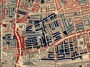 roads were unmade, often mere alleys, houses small and without foundations, subdivided and often around unpaved courts. An almost total lack of drainage and sewerage was made worse by the ponds formed by the excavation of brickearth. Pigs and cows in back yards, noxious trades like boiling tripe, melting tallow, or preparing cat's meat, and slaughter houses, dustheaps, and 'lakes of putrefying night soil' added to the filth