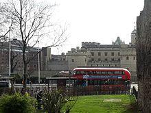 The first railway ('The Commercial Railway') to be built, in 1840, was a passenger service based on cable haulage by stationary steam engines that ran the 3.5 miles (5.6 km) from Minories to Blackwall on a pair of tracks. It required 14 miles (22.5 km) of hemp rope, and 'dropped' carriages as it arrived at stations, which were reattached to the cable for the return journey, and the train 'reassembling' itself at the terminus.[32] The line was converted to standard gauge in 1859, and steam locomotives adopted. The building of London termini at Fenchurch Street (1841),[33] and Bishopsgate (1840) provided access to new suburbs across the River Lea, again resulting in the destruction of housing and increased overcrowding in the slums. After the opening of Liverpool Street station (1874), Bishopsgate railway station became a goods yard, in 1881, to bring imports from Eastern ports. With the introduction of containerisation, the station declined, suffered a fire in 1964 that destroyed the station buildings, and it was finally demolished in 2004 for the extension of the East London Line. In the 19th century, the area north of Bow Road became a major railway centre for the North London Railway, with marshalling yards and a maintenance depot serving both the City and the West India docks. Nearby Bow railway station opened in 1850 and was rebuilt in 1870 in a grand style, featuring a concert hall. The line and yards closed in 1944, after severe bomb damage, and never reopened, as goods became less significant, and cheaper facilities were concentrated in Essex.[34]