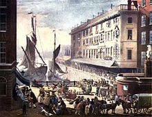 The West India Docks were established in 1803, providing berths for larger ships and a model for future London dock building. Imported produce from the West Indies was unloaded directly into quayside warehouses. Ships were limited to 6000 tons.[27] The old Brunswick Dock, a shipyard at Blackwall became the basis for the East India Company's East India Docks established there in 1806.[28] The London Docks were built in 1805, and the waste soil and rubble from the construction was carried by barge to west London, to build up the marshy area of Pimlico. These docks imported tobacco, wine, wool and other goods into guarded warehouses within high walls (some of which still remain). They were able to berth over 300 sailing vessels simultaneously, but by 1971 they closed, no longer able to accommodate modern shipping.[29] The most central docks, St Katharine Docks, were built in 1828 to accommodate luxury goods, clearing the slums that lay in the area of the former Hospital of St Katharine. They were not successful commercially, as they were unable to accommodate the largest ships, and in 1864, management of the docks was amalgamated with that of the London Docks.[30] The Millwall Docks were created in 1868, predominantly for the import of grain and timber. These docks housed the first purpose built granary for the Baltic grain market, a local landmark that remained until it was demolished to improve access for the London City Airport.[31]