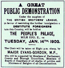 In the 1870 and 80s, so many Jewish émigrés were arriving that over 150 synagogues were built. Today there are only four active synagogues remaining in Tower Hamlets: the Congregation of Jacob Synagogue (1903 – Kehillas Ya'akov), the East London Central Synagogue (1922), the Fieldgate Street Great Synagogue (1899) and Sandys Row Synagogue (1766).[91] Jewish immigration to the East End peaked in the 1890s, leading to anti-foreigner agitation by the British Brothers League, formed in 1902 by Captain William Stanley Shaw and the Conservative MP for Stepney, Major Evans-Gordon, who had overturned a Liberal majority in the 1900 General Election on a platform of limiting immigration. In Parliament in 1902, Evans-Gordon claimed that "not a day passes but English families are ruthlessly turned out to make room for foreign invaders. The rates are burdened with the education of thousands of foreign children."[92] Jewish immigration only slowed with the passing of the Aliens Act 1905, which gave the Home Secretary powers to regulate and control immigration.[93]