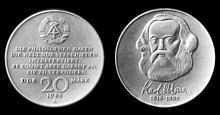 There were 123 commemorative coins altogether, with face values of 5, 10 or 20 Mark. The coins were released for various anniversaries or special events. Silver, copper/nickel/ zinc (German silver / nickel silver) or other alloys were used for the coins. A complete list of all released commemorative coins can be found in the "Liste der Gedenkmünzen der DDR".[5] Some of the commemorative coins were produced in very large volumes, especially the one shown above. These coins entered circulation, because they had little or no additional value for collectors due to the large numbers issued.