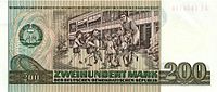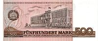| The Staatsbank der DDR (State Bank of the GDR) had planned to issue 200 and 500 Mark der DDR notes. The notes were printed in 1971 and in 1984 in preparation for issue, but were never circulated. A few examples are held by collectors. Unlike the lower-denomination notes, these notes did not have a personality on the obverse. The 200 Mark der DDR note had on its front a family with two children in front of a modern GDR high-rise apartment building. The back pictured a schoolyard with eight children and a teacher. The watermark was a dove of peace. On the 500 Mark der DDR note, the front showed the coat-of-arms of the GDR (hammer and a compass in a wreath), while the back showed the State Council (Staatsrat) building of the GDR in Berlin. |
