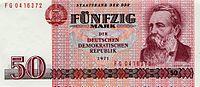 | On the red 50 Mark der DDR note is a picture of Friedrich Engels, the co-founder of Marxist theory. The reverse shows an industrial complex like those in the PCK Raffinerie in Schwedt. The confusion of pipes and smokestacks in the chemical plants and power stations highlighted the importance of industry in the GDR. | ||