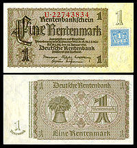 | Old Rentenmark and Reichsmark notes then in circulation in the Soviet occupation zone had adhesive stamps affixed in June 1948 to extend their validity while new banknotes were being printed (see Currency reform above). These notes were issued in denominations of 1, 2, 5, 10, 20, 50 and 100 Deutsche Mark. Colloquially, these reissued banknotes were referred to as Klebemark ("sticker marks") or Kuponmark ("coupon marks"). | ||