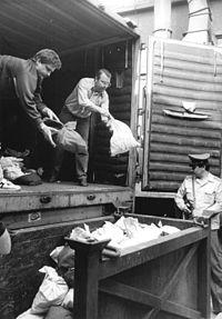 In July 2001, it was discovered that two Halberstadt residents (aged 24 and 26) had gained entry to the tunnel system through an unsecured opening and made off with numerous banknotes. The two residents were convicted of the crime and sentenced to four months in prison and three years of probation. Furthermore, they had to pay €120 to a non-profit organisation. The appearance among collectors of uncirculated 200 and 500 Mark der DDR notes, and of the never-issued military currency, is attributed to this theft. Because of the theft and the slowness of the rotting, the KfW then decided to burn the old currency. Between April and June 2002, 298 containers of the currency remains were burned in an incinerator (six containers per day) along with household refuse. The last container was burned on 25 June 2002.[2][3]