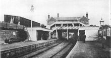 The first station to serve East Grinstead was built by the East Grinstead Railway as the terminus of its 6-mile-67-chain (11.0-kilometre) single-track line from Three Bridges.[3] It was opened on 9 July 1855[4][3][5][6][7] in Swan Mead off the London Road, well-situated for the town centre,[8][9][10] with the first train out at 12:12 pm.[11][12] Constructed at a cost of £3,000, the station comprised a sandstone main building which survives to this day, as well as timber goods and engine sheds with slate roofs.[8][13][14][15][16] The goods facilities were described in a specification as being equal to those at Hailsham railway station.[8] There were probably two platform faces and the goods yard was on the up side.[10] The first stationmaster was a Peter Nesbitt;[8] he remained in post until his death on 10 September 1864.[17] The initial passenger service consisted of six trains each way daily and two on Sundays; trains started and finished at East Grinstead.[8][10][12] The service appears to have exceeded expectations as the service increased to nine each way on weekdays, with three on Sundays.[10][12] So well-patronised were the Sunday services that Reverend Woodington, the curate of East Grinstead, regularly visited the station to distribute religious tracts requesting passengers to "listen to the church bells instead of the railway bells."[12]