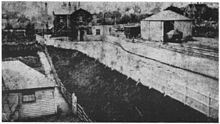 By July 2009, service pipes and a permanent messing facility had been installed on the site.[122] Construction on the back wall of the platform began on 10 August 2009.[122] All utilities and cabling had to be routed under or through the platform due to the long and thin shape of the plot.[112] Tracklaying in the station area was complete by June 2010, following which the first train over the section carrying waste from Imberhorne cutting ran on 6 July.[126][127] GB Railfreight (GBRf), which had been contracted to run occasional trains, ran the first of its services carrying 1,000 tons of excavated rubbish from Imberhorne Cutting to disposal sites, initially at Calvert.[128] The total to be removed was some 90,981 tons, achieved by December 2011.[129] The waste had been deposited in the 60-foot-deep (18 m) and quarter-mile-long (400 m) Hill Place Cutting which was purchased and designated as a landfill tip by East Grinstead Town Council in the late 1960s and used for around 25 years.[130][131][132]