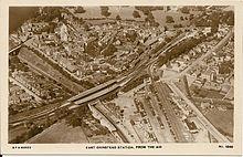 The low level station was set at a right-angle to the high level and it had two platforms to serve the L&EG and CO&EG.[40][48][49] From the L&EG's opening on 1 August 1882 until 14 October 1883, services continued to use the 1866 station as the new station was still in construction and because residents found the older station more convenient for the town centre.[4][50][40][41] On 15 October 1883 both high and low level stations opened and the 1866 station was closed.[51][4][52][46][36][53] The old station was later demolished in February 1908 and sold for scrap for £15.[51][29][54] The bridge over the London Road was demolished in 1978 with the construction of the Inner Relief Road.[31] The CO&EG opened for traffic on 10 March 1884 with a service of four trains each way between Brighton and London Bridge via Oxted, plus four South Eastern services each way between London Bridge and Oxted.[55] The new line to London was 6 miles (9.7 kilometres) shorter than the route via Three Bridges but some passengers continued to use the old line for the fast services from Three Bridges.[55]