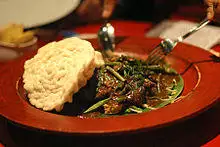 Some typical East Javanese dishes include Bakso Malang, Rawon, and Tahu Campur Lamongan.[58] Surabaya is famous for Rojak Cingur, Semanggi, Lontong Balap, clam satay, mussels, and rice cakes.[59] Malang is popular for a variety of processed fruits (especially apples), tempeh crisps, Bakpao telo, Bakso Malang, rawon, and Cwie noodles.[60] Kediri is famous for tahu takwa, tahu pong, tungku fried rice and getuk pisang.[61][62] Madiun is known for pecel madiun, and as a producer of Brem.[63] The subdistrict of Babat, Lamongan is famous as a producer of wingko.[64] Bondowoso is also well known as a producer of tape. Gresik famous is for nasi krawu, otak-otak bandeng, and bonggolan. Sidoarjo is famous for shrimp crackers, shrimp paste, and petis. Ngawi is famous[65] for tempeh chips, tahu tepo, and nasi lethok. Blitar has the typical food that is pecel. Rambutan is also native to Blitar. Banyuwangi is famous[66] for sego tempong, salad soup, and pecel rawon. Jember have special food made of tape that is Suwar-suwir and tape proll that is very sweet. Corn is known as one of the staple food of the Madurese, while cassava is processed into gaplek, a staple food used to be a part of the population in Pacitan and Trenggalek. Tulungagung is famous for its lodho, goat satay and pati rice.[67] Ponorogo is famous for Satay Ponorogo, Tiwul Goreng and Dawet Jabung
