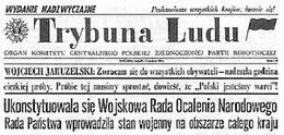 The control of the media was exercised directly by the communist party itself, and by state censorship, which was also controlled by the party.[103] Media served as an important form of control over information and society.[104] The dissemination and portrayal of knowledge were considered by authorities to be vital to communism's survival by stifling alternative concepts and critiques.[104] Several state Communist Party newspapers were published, including: