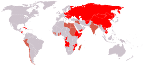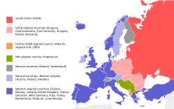 Although the Soviet Union and its rival the United States considered Europe to be the most important front of the Cold War, the term Eastern Bloc was often used interchangeably with the term Second World. This broadest usage of the term would include not only Maoist China and Cambodia, but short-lived Soviet satellites such as the Second East Turkestan Republic (1944–1949), the People's Republic of Azerbaijan, and Republic of Mahabad (1946), as well as the Marxist–Leninist states straddling the Second and Third Worlds before the end of the Cold War: the People's Democratic Republic of Yemen (from 1967), the People's Republic of the Congo (from 1969), the People's Republic of Benin, the People's Republic of Angola and People's Republic of Mozambique from 1975, the People's Revolutionary Government of Grenada from 1979 to 1983, the Derg/People's Democratic Republic of Ethiopia from 1974, and the Somali Democratic Republic from 1969 until the Ogaden War in 1977.[7][8][9][10] Many states were also accused by the Western Bloc of being in the Eastern Bloc when they were actually part of the Non-Aligned Movement. The most limited definition of the Eastern Bloc would only include the Warsaw Pact states and the Mongolian People's Republic as former satellite states most dominated by the Soviet Union. However, North Korea was similarly subordinate before the Korean War and Soviet aid during the Vietnam War enabled Vietnam to dominate Laos and Cambodia until the end of Cold War.[11][12] Cuba's defiance of complete Soviet control was noteworthy enough that Cuba was sometimes excluded as a satellite state altogether, as it sometimes intervened in other Third World countries even when the Soviet Union opposed this.[6]