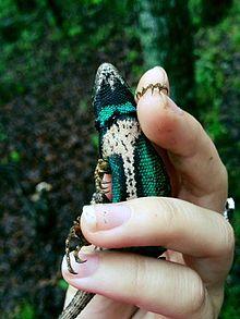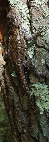 The eastern fence lizard (Sceloporus undulatus) is a medium-sized species of lizard in the family Phrynosomatidae.[3] The species is found along forest edges, rock piles, and rotting logs or stumps in the eastern United States. It is sometimes referred to as the prairie lizard, fence swift, gray lizard, northern fence lizard or pine lizard.[4] It is also referred to colloquially as the horn-billed lizard.