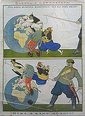 The immediate reason for Russia's involvement in the First World War was a direct result of the decisions made by the statesmen and generals during July 1914. The July crisis was the culmination of a series of diplomatic conflicts that took place in the decades prior to 1914, and this is fundamental to an understanding of Russia's position immediately prior to the War. According to D. C. Lieven, Russia was formidable and was able to back up her diplomatic policies with force. One of the most significant factors in bringing Russia to the brink of war was the downfall of her economy.[27] The 20 percent jump in defense expenditure during 1866–77 and in 1871-5 forced them to change their position within Europe and shift the balance of power out of her favour.[28] At the time, Russian infrastructure was backward and the Russian government had to invest far more than its European rivals in structural changes. In addition there were overwhelming burdens of defense, which would ultimately result in an economic downfall for the Russians. This was a major strain on the Russian population, but also served as a direct threat to military expenditure.[29] Thus the only way the Russians could sustain the strains of European war would be to place more emphasis on foreign investment from the French who essentially came to Russia's aid for industrial change.[30] The Franco-Russian Alliance allowed for the Russian defense to grow and aid the European balance of power during the growth of the German Empire's might. Nevertheless, one of the key factors was that of the Russian foreign policy between 1890 and 1914.