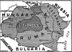 In the immediate years preceding the First World War, the Kingdom of Romania was involved in the Second Balkan War on the side of Serbia, Montenegro, Greece and the Ottoman Empire against Bulgaria. The Treaty of Bucharest, signed on August 10, 1913, ended the Balkan conflict and added 6,960 square kilometers to Romania's territory.[24] Although militarized, Romania decided upon a policy of neutrality at the start of the First World War, mainly due to having territorial interests in both Austria-Hungary (Transylvania and Bukovina) and in Russia (Bessarabia). Strong cultural influences also affected Romanian leanings, however. King Carol I, as a Hohenzollern-Sigmaringen, favoured his Germanic roots, while the Romanian people, influenced by their Orthodox church and Latin-based language, were inclined to join France. Perhaps King Carol's attempts at joining the war on the side of the Central powers would have been fruitful had he not died in 1914, but Romanian disenchantment with Austria-Hungary had already influenced public and political opinion. French endorsement of Romanian action against Bulgaria, and support of the terms of the Treaty of Bucharest was particularly effective at inclining Romania towards the Entente. Furthermore, Russian courting of Romanian sympathies, exemplified by the visit of the Tsar to Constanța on June 14, 1914, signaled in a new era of positive relations between the two countries.[25] Nevertheless, King Ferdinand I of Romania maintained a policy of neutrality, intending to gain the most for Romania by negotiating between competing powers. The result of the negotiations with the Entente was the Treaty of Bucharest (1916), which stipulated the conditions under which Romania agreed to join the war on the side of the Entente, particularly territorial promises in Austria-Hungary: Transylvania, Crișana and Maramureș, the whole Banat and most of Bukovina. According to historian John Keegan, these enticements offered by the Allies were never concrete, for in secret, Russia and France agreed not to honor any conventions when the end of the war came.[26]