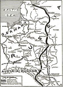 By mid-1915, the Russians had been expelled from Russian Poland and hence pushed hundreds of kilometers away from the borders of the Central Powers, removing the threat of Russian invasion of Germany or Austria-Hungary. At the end of 1915 German-Austrian advance was stopped on the line Riga–Jakobstadt–Dünaburg–Baranovichi–Pinsk–Dubno–Tarnopol. The general outline of this front line did not change until the Russian collapse in 1917.