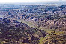 Though the prairie landscape of eastern Montana has traditionally been considered a part of the Great Plains, a recent (early 2010s) study has shown that, at least in some ways, the biomes of Eastern Montana have more in common and share more species with the Intermountain West scrub steppes and the Palouse of Eastern Washington than they have with the neighboring plains of The Dakotas.[5] Some parts of eastern Montana, in areas most prone to drying chinooks, have near-desert conditions and scrub rather than grassland.[6] Eastern Montana also has breaks and highlands that are widely forested, such as the Custer National Forest and areas around Fort Peck Lake, contrary to the almost completely treeless plains of the Midwest.