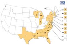 As of September 2019, a notable uptick in cases erupted in New England and Michigan, prompting some health departments to declare an outbreak.[12][13][14][15][16][17][18] As of 31 October 2019, five people died in Michigan,[19][20] three people died in Connecticut,[21] one person died in Rhode Island,[18] one person died in Alabama,[22] one person died in Indiana,[23] and three people died in Massachusetts.[24][25][26] The virus was also found in goats,[27] in turkeys,[28] in deer,[28] and in horses.[29][20][30][18][28]