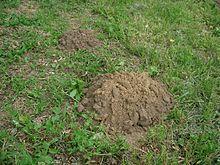 When digging new burrows, the eastern mole will push excess soil up through vertical shafts called "molehills". New burrows just below the surface are marked by ridges and molehills, and such burrows appear to be used to facilitate the capture of earthworms and other soil life after a rain. In building burrows and probably at other times, the mole uses its nose as a tactile organ, poking about here and there. In friable soil, the species can burrow at a rate of 6 m/h.[4]