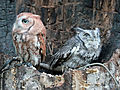 While eastern screech owls have lived for over 20 years in captivity, wild birds seldom, if ever, live that long. Mortality rates of young and nestling owls may be as high as 70% (usually significantly less in adult screech owls). Many losses are due to predation. Common predators at screech owl nests including Virginia opossums (Didelphis virginiana), American minks (Neovison vison), weasels (Mustela ssp.), raccoons (Procyon lotor), bassarisks (Bassariscus astutus), skunks, snakes, crows (Corvus ssp.), and blue jays.[3][9][22] Eastern fox squirrels (Sciurus niger) may raid the tree holes being used by eastern screech owls, not only destroying or consuming the eggs, but also displacing the adult owls from the hole to use the hole for themselves.[20] Adults have fewer predators, but larger species of owls do take them, since they have similar periods of activity. Larger owls known to have preyed on eastern screech owls have included great horned owls, barred owls (Strix varia), spotted owls (Strix occidentalis), long-eared owls (Asio otus), short-eared owls (Asio flammeus), and snowy owls (Bubo scandianus). Diurnal birds of prey may also kill and eat them, including Cooper's hawks (Accipiter cooperii), northern harriers (Circus cyaenus), red-tailed hawks (Buteo jamaciensis), red-shouldered hawk (Buteo lineatus) and rough-legged hawks (Buteo lagopus).[3][18] Most prolific by far of the eastern screech owl's avian predators is the great horned owl, which can destroy up to 78% of a local population, but locally, Cooper's hawks and barred owls are almost as serious of a threat.[20][23] A most dramatic case illustrating the owl food chain involved a barred owl, which upon examination after being shot in New England, contained a long-eared owl in its stomach that, in its own stomach, contained an eastern screech owl.[18] All other common owls in this species range also live on similar rodent prey, but direct competition is obviously disadvantageous to the screech owl. One exception is the even smaller northern saw-whet owl, on which eastern screech owls have been known to prey.[3] In rural Michigan, 9 different species of owls and diurnal raptors including the screech owl fed primarily on the same four species of small rodents from the Peromyscus and Microtus genera.[20] Eastern screech owls have had nesting attempts fail due to biocide poisoning, which causes the thinning of eggs and failure of nests, but seemingly not to the overall detriment of the species. Collisions with cars, trains, and windowpanes kill many screech owls, the earlier especially while feeding on road-side rodents and road kills.[24][25]