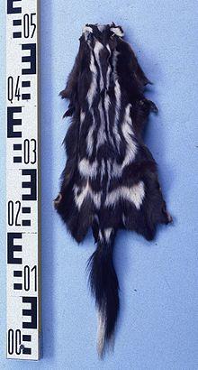 The eastern spotted skunk has a small weasel-like body with fine, dense black fur that has 4 to 6 broken, white stripes.[7] Two of the stripes are located at the median of the body and four stripes are placed on the side running from the back of the head to the rear. White markings are present on both cheeks, as well as on the tip of the tail. This is known as an aposematic fur pattern and is thought to act as a warning to predators.
