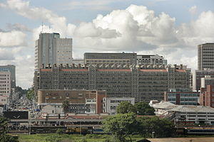 The Eastgate Centre is a shopping centre and office block in central Harare, Zimbabwe whose architect is Mick Pearce. Designed to be ventilated and cooled by entirely natural means, it was probably the first building in the world to use natural cooling to this level of sophistication. It opened in 1996 on Robert Mugabe Avenue and Second Street, and provides 5,600 m² of retail space, 26,000 m² of office space and parking for 450 cars.