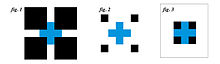 Sarcone's Cross illusion consists of a cross (the test shape) surrounded by sets of squares of distinct size (the inducing shapes). As shown in the diagram opposite, the three blue crosses are exactly the same size; however, the one on the left (fig. 1) tends to appear larger. The illusion works even when the small squares completely occlude the blue cross (see fig. 3). In conclusion, there isn’t always correlation between the size of the surrounding shapes and the relative size perception of the test shape.