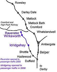 Wirksworth station was reopened in 2002, with the first 1&fras1;2 mile (0.80 km) of line between Wirksworth and Gorsey Bank reopened for a DMU shuttle passenger service in 2004, followed by a new line to Ravenstor in 2005.[6] On 8 March 2008, the railway began to branch its passenger operations further south by holding a grand opening ceremony[7] for the line between Wirksworth station and Idridgehay station[8] - 3 1&fras1;2 miles (5.6 km) of the line's total length.