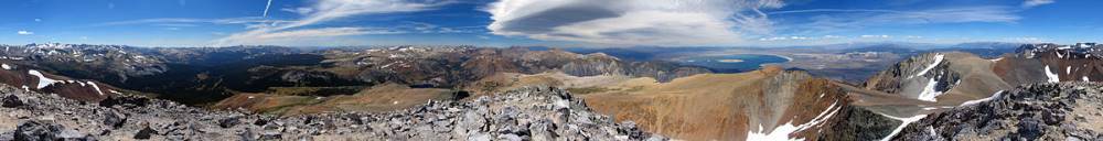 The alpine zone begins near 10,500 feet (3,200 m) elevation (in the southern Sierra) and near 9,000 feet (2,700 m) (in the north).[9] This zone is easily distinguished as it is above the tree line. No trees grow in this zone due to the harsh climatic conditions. Short, cool summers with long, cold, and snowy winters are typical at these elevations. Many exposed granitic outcroppings, talus slopes, and boulder fields limit the amount of vegetation that grows here. The herbaceous plants need to flower and produce their seeds quickly during the short, frost-free period of summer.[3] Flora includes cushion plants, grasses, willows, and sedges.[9] The macrolichen flora in the Sierra Nevada alpine zone is not well developed as compared to neighboring alpine zones in the Rocky Mountains and mountains of the Pacific Northwest.[13][14] Some animal species that are adapted to this zone include the American pika, Belding's ground squirrel, the yellow-bellied marmot, and the endangered Sierra Nevada bighorn sheep.[4] This zone can be viewed up close by hiking or climbing into the high elevations of the Sierra.