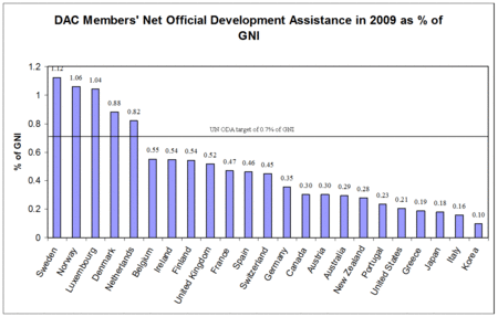 Official development assistance as a percentage of gross national income contributed by the top 10 DAC countries is as follows. Five countries met the longstanding UN target for an ODA/GNI ratio of 0.7% in 2013:[7]
