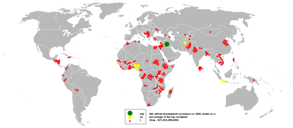 Humanitarian aid is argued to often not reach those who are intended to receive it. For example, a report composed by the World Bank in 2006 stated that an estimated half of the funds donated towards health programs in sub-Saharan Africa did not reach the clinics and hospitals. Money is paid out to fake accounts, prices are increased for transport or warehousing, and drugs are sold to the black market. Another example is in Ghana, where approximately 80% of donations do not go towards their intended purposes. This type of corruption only adds to the criticism of aid, as it is not helping those who need it, and may be adding to the problem.[33] Only about one fifth of U.S. aid goes to countries classified by the OECD as 'least developed.'[35] This "pro-rich" trend is not unique to the United States.[34][35] According to Collier, "the middle income countries get aid because they are of much more commercial and political interest than the tiny markets and powerlessness of the bottom billion."[36] What this means is that, at the most basic level, aid is not targeting the most extreme poverty.[34][35]