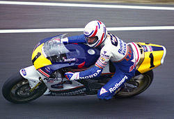 Lawson accepted an offer from Yamaha to contest the 500cc World Championship as Kenny Roberts' teammate for the 1983 season. Lawson spent the 1983 season learning the ropes of the Grand Prix circuit. In 1984, Lawson began winning regularly and won the 1984 World Championship.[1] It would mark the first of four world titles Lawson would go on to win.[1] In 1985, he won the prestigious Imola 200 pre-season race.[4] After winning two more titles for Yamaha in 1986 and 1988, Lawson shocked the racing world by announcing he would be leaving Yamaha to sign with their arch-rivals Rothmans Honda as teammate to his own archrival, Australia's 1987 World Champion Wayne Gardner. By switching teams, Lawson also fulfilled his desire to work with Erv Kanemoto. After Gardner crashed and broke his leg during the third round at Laguna Seca, Lawson went on to win the 1989 title for Honda, becoming the first rider to win back-to-back championships on machines from different manufacturers before Valentino Rossi did so in 2004 (moved from Honda to Yamaha). By winning with both Yamaha and Honda, Lawson silenced his critics who believed he would not be as successful away from the factory Marlboro Yamaha team.[2] Furthermore, he was the fourth satellite rider to win the premier class world title before Valentino Rossi did so in 2001, 12 years later.