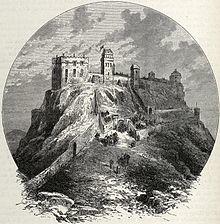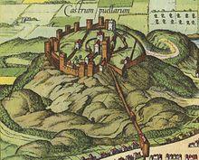 Archaeological investigation has yet to establish when the Castle Rock was first used as a place of human habitation. There is no record of any Roman interest in the location during General Agricola's invasion of northern Britain near the end of the 1st century AD. Ptolemy's map of the 2nd century AD[11] shows a settlement in the territory of the Votadini named "Alauna", meaning "rock place", making this possibly the earliest known name for the Castle Rock.[12] This could, however, refer to another of the tribe's hill forts in the area. The Orygynale Cronykil of Andrew of Wyntoun (c. 1350 – c. 1423), an early source for Scottish history, names "Ebrawce" (Ebraucus), a legendary King of the Britons, as having "byggyd [built] Edynburgh".[13] According to the earlier chronicler, Geoffrey of Monmouth (c. 1100 – c. 1155), Ebraucus had fifty children by his twenty wives, and was the founder of "Kaerebrauc" (York), "Alclud" (Dumbarton) and the "Maidens' Castle".[14] The 16th-century English writer John Stow (c. 1525 – 1605), credited Ebraucus with building "the Castell of Maidens called Edenbrough" in 989 BC.[15] The name "Maidens' Castle" (Latin: Castra or Castellum Puellarum) occurs frequently up until the 16th century.[16] It appears in charters of David I (r. 1124–1153) and his successors,[17] although the reason for it is not known. William Camden's survey of Britain, Britannia (1607), records that "the Britans called [it] Castle Myned Agned [winged rock], the Scots, the Maidens Castle and the Virgins Castle, of certaine young maidens of the Picts roiall bloud who were kept there in old time".[18] According to the 17th-century antiquarian Father Richard Hay, the "maidens" were a group of nuns, who were ejected from the castle and replaced by canons, considered "fitter to live among soldiers".[19] However, this story was considered "apocryphal" by the 19th-century antiquarian Daniel Wilson and has been ignored by historians since.[20] The name may have been derived from a "Cult of the Nine Maidens" type of legend. Arthurian legends suggest that the site once held a shrine to Morgain la Fee, one of nine sisters.[21] Later, St Monenna, said to be one of nine companions, reputedly invested a church at Edinburgh, as well as at Dumbarton and other places.[22] Similar names are shared by many other Iron Age hillforts and may have simply described a castle that had never been taken by force[23] or derived from an earlier Brittonic name like mag dun.[24][25]