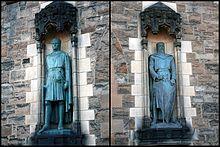 In March 1296, Edward I launched an invasion of Scotland, unleashing the First War of Scottish Independence. Edinburgh Castle soon came under English control, surrendering after a three days long bombardment.[46] Following the siege, Edward had many of the Scottish legal records and royal treasures moved from the castle to England.[45] A large garrison numbering 325 men was installed in 1300.[47] Edward also brought to Scotland his master builders of the Welsh castles, including Thomas de Houghton and Master Walter of Hereford, both of whom travelled from Wales to Edinburgh.[48] After the death of Edward I in 1307, however, England's control over Scotland weakened. On 14 March 1314, a surprise night attack by Thomas Randolph, 1st Earl of Moray recaptured the castle. John Barbour's narrative poem The Brus relates how a party of thirty hand-picked men were guided by one William Francis, a member of the garrison who knew of a route along the north face of the Castle Rock and a place where the wall might be scaled. Making the difficult ascent, Randolph's men scaled the wall, surprised the garrison and took control.[49] Robert the Bruce immediately ordered the slighting of the castle to prevent its re-occupation by the English.[50] Four months later, his army secured victory at the Battle of Bannockburn.[51][52]