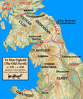 The castle does not re-appear in contemporary historical records from the time of Ptolemy until around AD 600. Then, in the epic Welsh poem Y Gododdin there is a reference to Din Eidyn, "the stronghold of Eidyn". This has been generally assumed to refer to the Castle Rock.[30] The poem tells of the Gododdin King Mynyddog Mwynfawr,[31] and his band of warriors, who, after a year of feasting in their fortress, set out to do battle with the Angles at "Catreath" (possibly Catterick) in Yorkshire. Despite performing glorious deeds of valour and bravery, the poem relates that the Gododdin were massacred.[32]