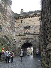 The Gatehouse at the head of the Esplanade was built as an architecturally cosmetic addition to the castle in 1888.[117] Statues of Robert the Bruce by Thomas Clapperton and William Wallace by Alexander Carrick were added in 1929, and the Latin motto Nemo me impune lacessit is inscribed above the gate. The dry ditch in front of the entrance was completed in its present form in 1742.[118] Within the Gatehouse are offices, and to the north is the most recent addition to the castle; the ticket office, completed in 2008 to a design by Gareth Hoskins Architects.[119] The road, built by James III in 1464 for the transport of cannon, leads upward and around to the north of the Half Moon Battery and the Forewall Battery, to the Portcullis Gate. In 1990, an alternative access was opened by digging a tunnel from the north of the esplanade to the north-west part of the castle, separating visitor traffic from service traffic.[120]